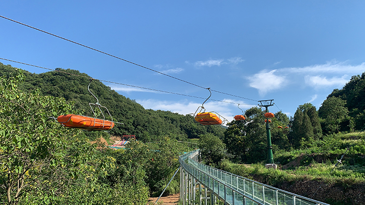 固定抱索器拖船索道主要用于漂流水滑,索道整體分布為驅動站、迂回站和線路部分,漂流船吊籃通過固定抱索器與鋼絲繩固定在一起。驅動站是為索道提供動力的部位,經迂回站的迂回輪導向后,把裝載有漂流船的運輸吊籃返回至上游的驅動站,達到運輸漂流船的目的,利用索道方式運輸漂流船的效率高。索道造價低,維護成本低,配置工作人員少,節(jié)約運輸成本。